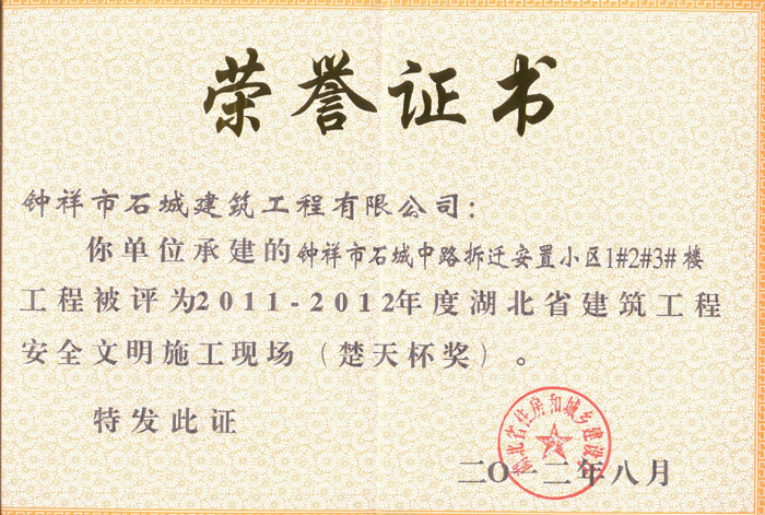 2012年8月被评为2011-2012年度湖北省建筑工程安全文明施工现场(楚天杯奖)