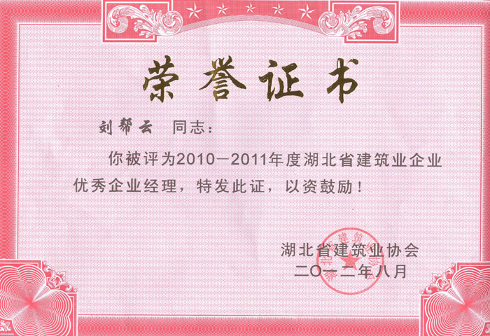 2012年8月刘帮云同志被评为2010-2011年度湖北省建筑企业邮箱企业经理