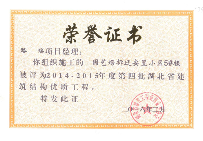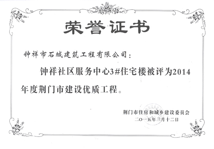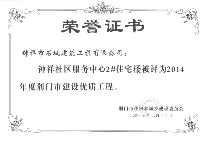 2015年3月12日被评为2014年度荆门市建设优质工程